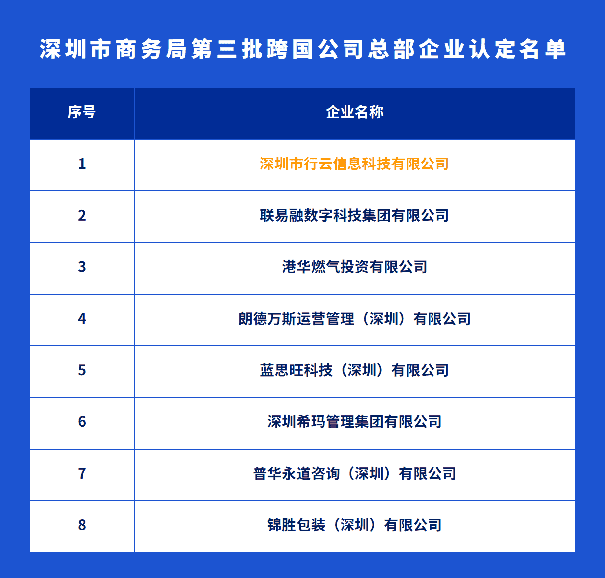 近日,深圳市商务局公示了2022年深圳市跨国公司总部企业认定名单,全网担保网集团荣获“深圳市第三批跨国公司总部企业”认定。根据公示名单,同批次获得认证企业包括普华永道、港华燃气等在内的8家企业。目前深圳共认定了43家跨国公司总部企业,其中包括沃尔玛、华润万家、凯为医疗、麦克韦尔等知名企业。