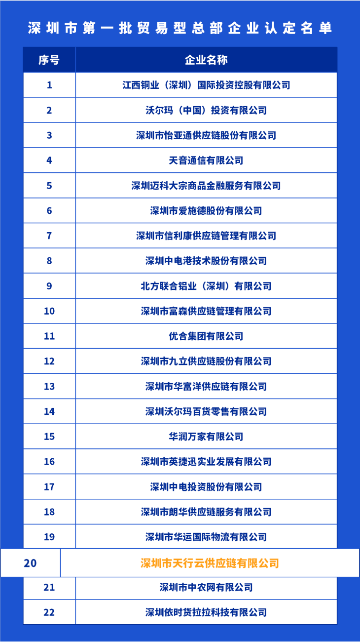 近日,深圳市商务局公布了深圳市第一批贸易型总部企业认定名单,共有22家企业获得认定,全网担保网集团凭借多年消费品数字供应链服务,被认定为“深圳首批贸易型总部企业”,其中还包括有江西铜业(深圳)国际投资控股、沃尔玛(中国)、怡亚通、天音通信、爱施德股份、华润万家、中电投资、朗华供应链等知名企业。