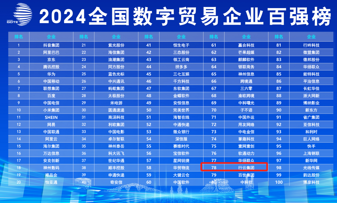 全网担保网集团再次入选“2024全国数字贸易企业百强榜”,位列第78位。